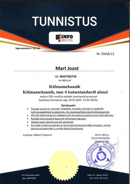 Olen Mart ja tegutsen torutööde valdkonnas alates 1990ndatest. Aastate jooksul olen omandanud rohkelt kogemusi ja oskusi ning sooritanud kliimatehniku neljanda pädevuskategooria kutseeksami. Teen koostööd mitmete maaletoojate ja partneritega, pakkudes klientidele usaldusväärseid ja professionaalseid lahendusi.